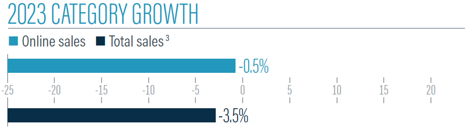 Those age 25-44 account for close to half of all online sales in the category. More specifically, the 25-34 age group accounted for nearly a quarter of all sales to the category’s retailers (23.0%), and those 35-44 accounted for more than a fifth (21%).
