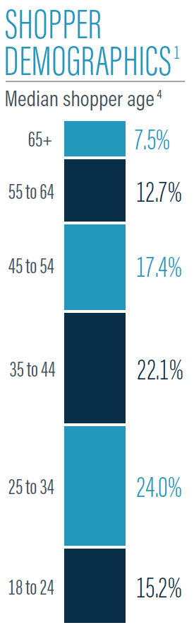 Those 35-44 accounted for 22.1% of the Top 1000 category’s sales, and those 45-54 accounted for 17.4%. Shoppers ages 55-64 accounted for 12.7% of the category’s sales.