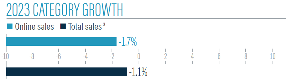 Sales declined in the Sporting Goods category, and they declined more online (1.7% year over year) than they did at physical stores. Total sales (online and offline) declined just 1.1% for the category.