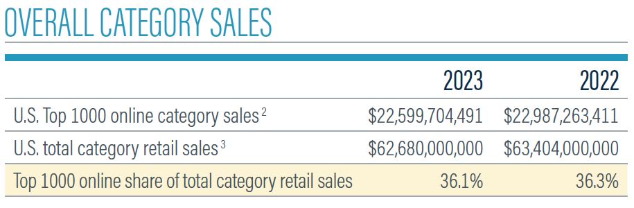 The share of Top 1000 sales from Sporting Good retailers dipped slightly in 2023 — to 36.1% from 36.3% in 2022. Total sporting good sales in the U.S. (at physical stores and online) also dipped to $62.68 billion in 2023 from $63.40 billion in 2022. So U.S. Sporting Goods sales fell both online and in physical stores in 2022.
